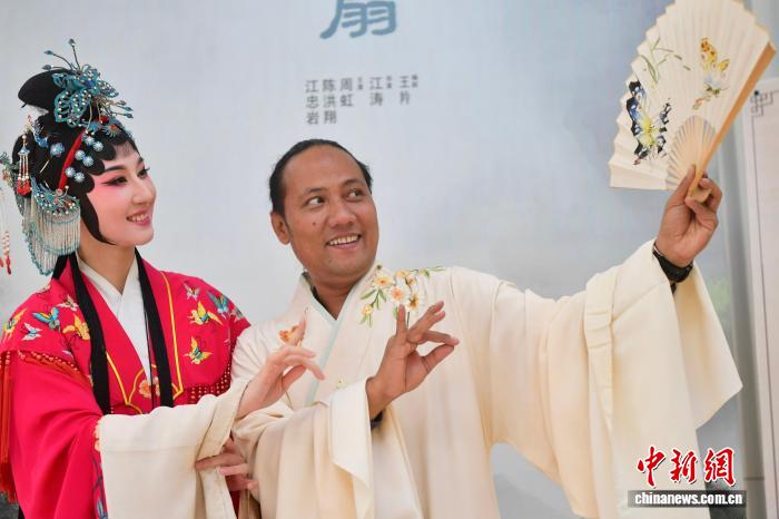 图为丝路电影节海外嘉宾观影后向福建省实验闽剧院的演员学习闽剧。中新网记者 张斌 摄